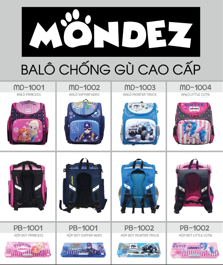 Balo chống gù cao cấp Mondez với các mã sản phẩm: Balo Princess, Balo Super Hero, Balo Litte Cute và Balo Monster Truck siêu nhẹ được nghiên cứu và phát triển dựa trên thể trạng của học sinh Việt Nam. Phù hợp với lứa tuổi tiểu học – từ lớp 1 đến lớp 6 – với kích thước gọn nhẹ – chiều cao 36cm x chiều rộng 30cm(MD-1001; MD-1002) và 28 cm (MD-1003 ; MD-1004) x chiều dày 15cm.