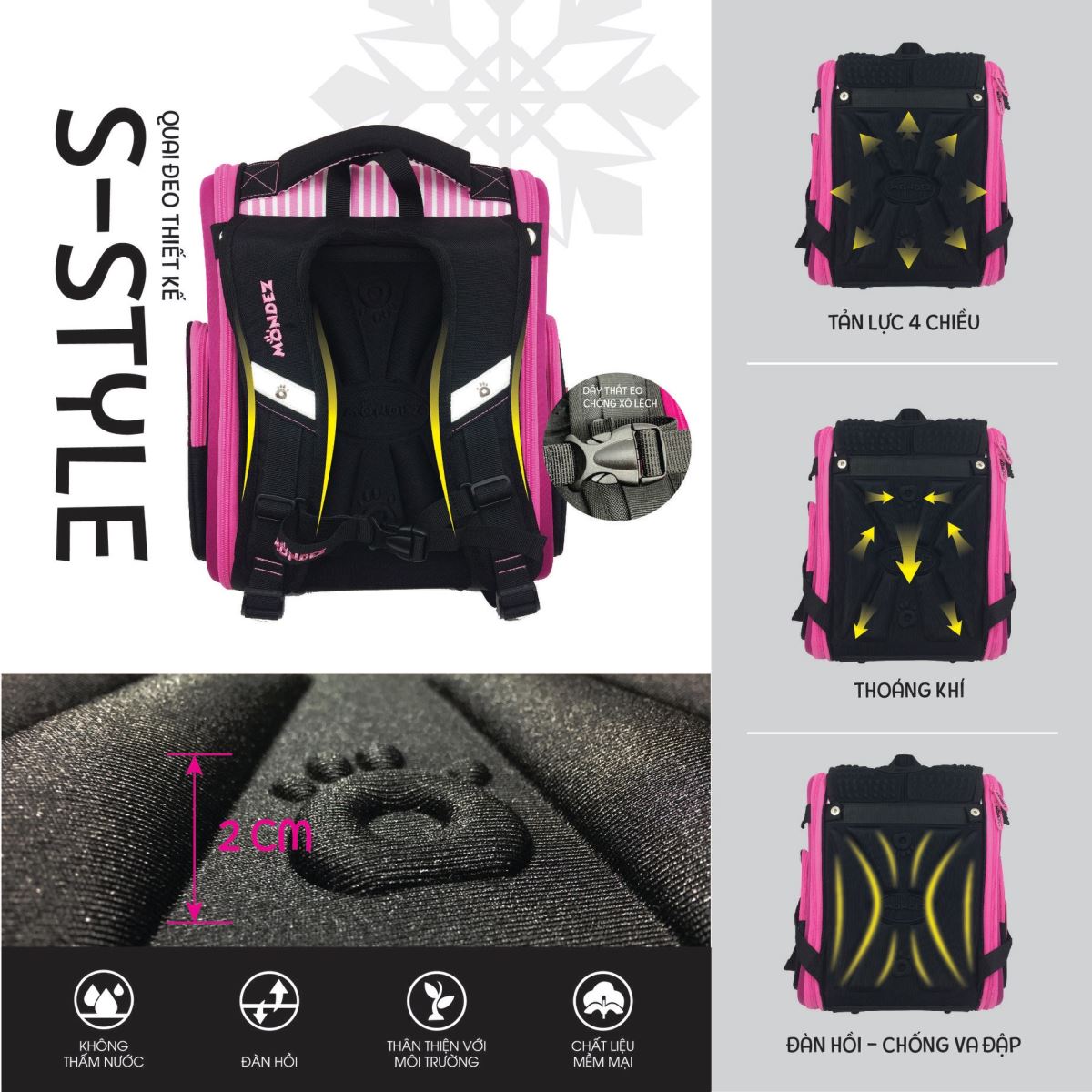 Đặc biệt, Thiết kế chống gù lưng hiệu quả : Quai đeo cặp thiết kế S-style, dây thắt eo và hệ thống tản lực 4 chiều, chia đều áp lực lên vai, lưng và hông, giảm nhẹ áp lực cho cột sống. Đệm bảo vệ thắt lưng dày 2cm đàn hồi, chống va đập mạnh, giúp bé không bị đau mỏi vai và lưng. Rãnh thoáng khí: lưu chuyển không khí giúp lung bé luôn thoáng mát. Thiết kế hoàn toàn thân thiện với cấu trúc xương sống của trẻ em Việt Nam.
